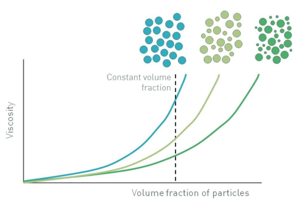 حداکثر غلظت حجمی وابسته به توزیع اندازه ذرات و شکل و اندازه آن ها می باشد. یک توزیع وسیع اندازه ذرات باعث افزایش مقدار ϕmax می شود. در این حالت ذرات کوچک می توانند در میان حفرات ذرات بزرگ قرار گیرند {F.Liu, 2000}. در مورد شکل ذرات باید گفت که در سوسپانسیون های حاوی ذرات غیرکروی به هنگام چرخش، حجم قابل ملاحظه ای از ذرات به حركت آورده می شود لذا ناحیه آشفته حاصل از یک ذره غیرکروی بیشتر از یک ذره کروی با حجم یکسان است بنابراین می توان گفت ϕmax برای ذرات کروی بیشتر می باشد. رابطه Krieger-Dougherty نشان می دهد که با افزایش کسرحجمی ذرات، گرانروی افزایش می یابد {B.Bengisu, 2001} . در این رابطه ϕm غلظت حجمی بیشینه، ϕ كسر حجمی ذرات است.